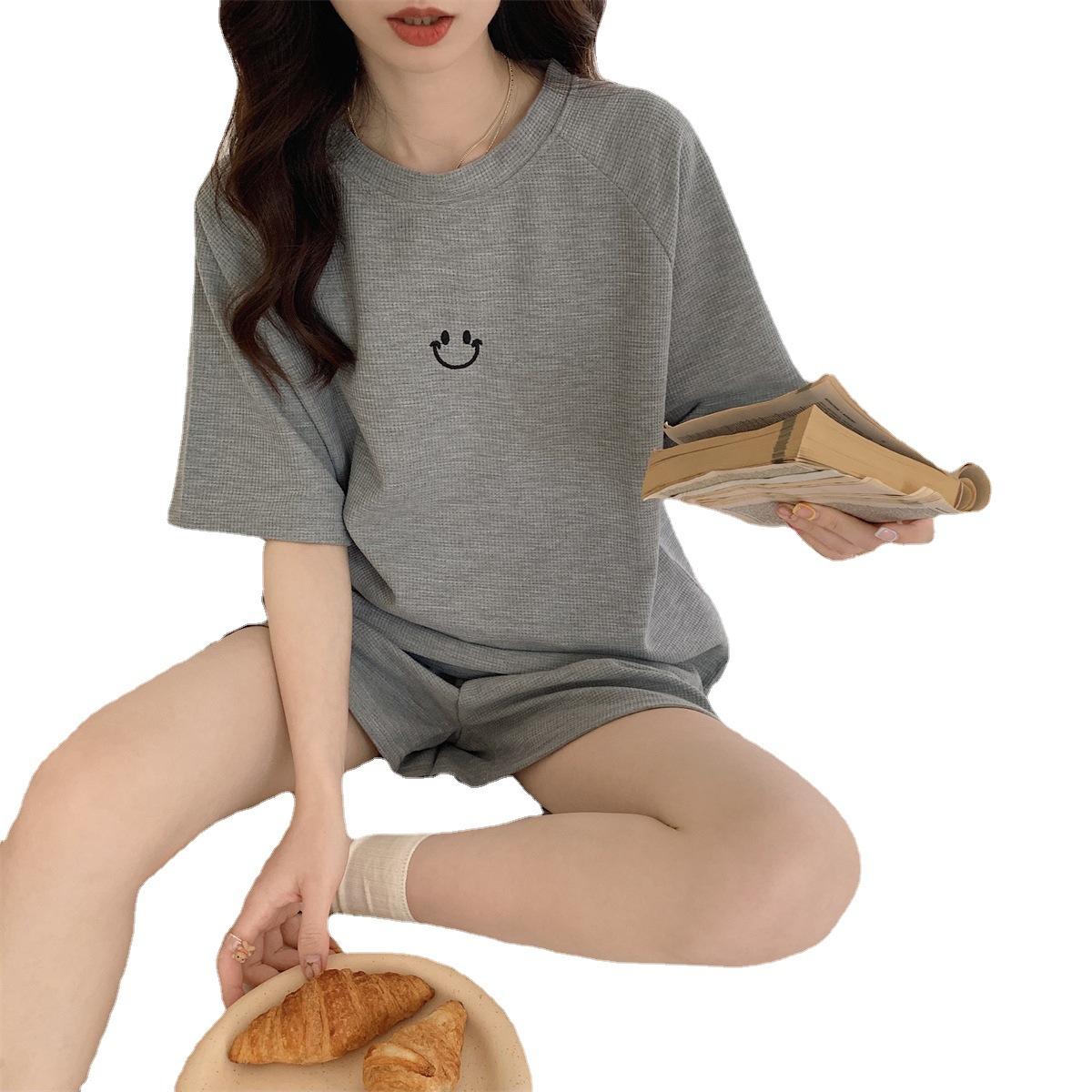 实拍短袖睡衣可爱笑脸华夫格简约圆领夏季家居服套装