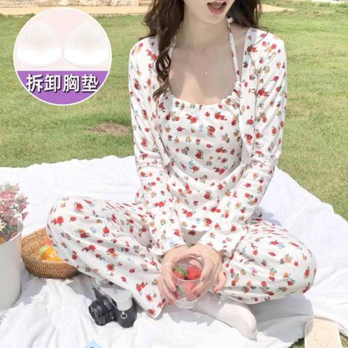 睡衣女春秋季棉质小碎花三件套小清新纯欲风性感吊带带胸垫家居服