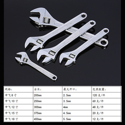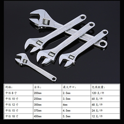 货源类别产地:山东|是否进口:否|订货号:004|品牌:其他|型号:004|货号:004|制式:公制|全长:200(mm)|最大开口:2.5(mm)|表面处理:镀锌|材质:45#钢|特性:普通|加工定制:是|是否跨境出口专供货源:否|规格:中性8寸(12个一件 请拍整件),中性10寸(12个一件 请拍整件),中性12寸(12个一件 请拍整件),中性15寸(12个一件 请拍整件),中性18寸(12个一件 请拍整件),申飞8寸(12个一件 请拍整件),申飞10寸(12个一件 请拍整件),申飞12寸(12个一件 请拍整件),申飞15寸(12个一件 请拍整件),申飞18寸(12个一件 请拍整件)|产品系列:活口扳手。