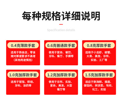 货源类别品牌:欣欣|进口:否|保质期:2|尺码:均码|功能:防油手套|厚度:0.4g、0.6g、0.8g、1.0g、1.2g|图案:透明|材质:HDPE|货号:la-7|加印LOGO:可以|加工定制:是|产地:中国|毛重:-|箱装数量:-|价格段:4元以下|只数:100只/袋|颜色:透明,50包起拍|新疆、西藏、内蒙古、海南、云南、青海等偏远地区除外|请联系客服补运费|规格:0.4克50只装,0.4克100只装,0.6克100只装,0.8克100只装,1.0克100只装,1.2克100只装,1.5克100只装|主要下游平台:LAZADA、独立站、ebay、wish、速卖通、亚马逊|主要销售地区:东南亚、非洲、中东、东北亚、南美、北美、欧洲|有可授权的自有品牌:否|是否跨境出口专供货源:是|是否有专利:否|特色服务:收藏加购优先发货|重量:0.4-1.2|订货号:lb-7