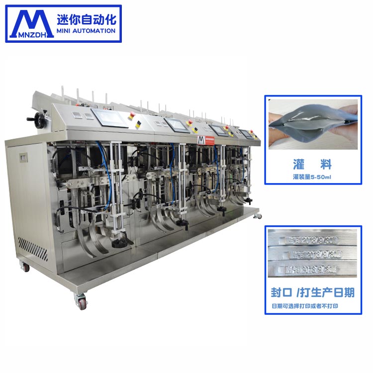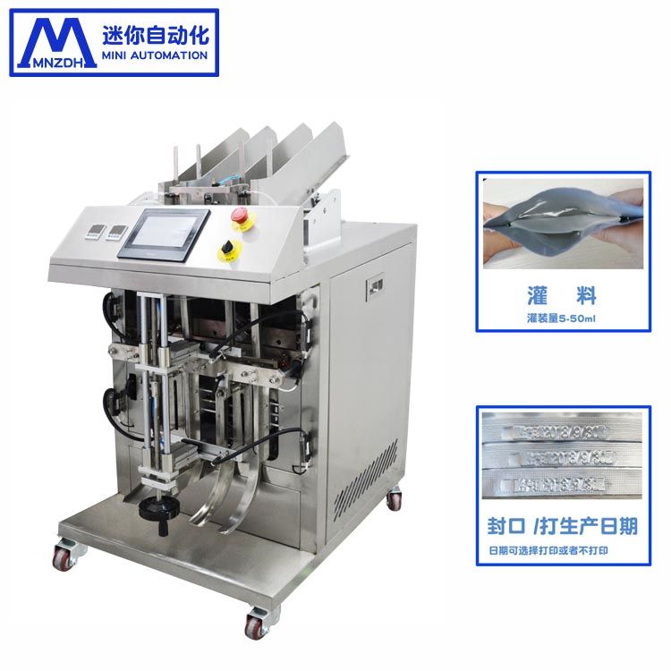 MN-T202产品详情机器特点:1,整机采用模块化设计易于维护,调整便捷。2,可自动完成取袋,面膜液充填,排气,封口,日期打印,成品输出,整形等一系列动作。3,采用进口电气和气动元器件,保障整机经久耐用,触摸屏操作,简洁明了。4,采用PID智能温度控制器,具有良好的热平衡,嵌入式,热封纹路清晰。5,真空部采用真空泵,真空压力稳定,动作可靠。6,可适应不同袋型,更换袋型调整方便。设备参数:1,包装速度:2300-2600袋/H2,包装袋尺寸:宽95-160长140-220mm3,包装袋材料复合膜电源220V4,功率:1.5KW5,气源:0.6Mpa6,生产流程:自动下袋——开袋——充填(精华)——封口(带钢打字)——输出——压平(液体均匀)。7,充填头数2个封刀宽200mm8,磁力泵充填,量约5-40ml9,设备尺寸:8806601100mm10,机重:150KG技术特点:1,PLC和触摸屏控制系统,性能稳定,操作方便。2,采用磁力泵充填装置,充填量准确度高。3,三轴步进驱动换工位,松下PLC+Eviev触摸屏。网站链接//www.mn-zdh.com//www.szmnzdh.com//www.mn-pack.com |