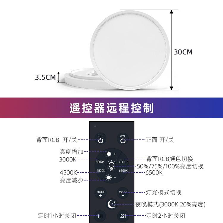 光源功率:20W(白色款),20W(黑色款)|灯光颜色:背光RGB+正面3000-6500K|适用场所:楼道,客厅,卧室,书房,走廊,庭院,餐厅,厨房,卫生间,玄关,阳台,酒店客房,展厅,库房,其他|风格:现代简约|吸顶灯类型:亚克力吸顶灯|货号:RGB-XDD-002|品牌:other/其他|电压:110|平均使用寿命:20000|光源类型:led灯|灯罩外形:圆形|照射面积:10㎡ -15㎡|型号:GLS-RGB-XDD|是否跨境出口专供货源:是|主要下游平台:亚马逊|主要销售地区:北美|适用人群:大众|空间:客厅,卧室,书房,室外,餐厅,厨房,浴室,卫生间,玄关,阳台,儿童房,商用场所,其他|是否提供安装服务:否|是否配送上门:送货至提货点|产地:广东东莞|是否一般纳税人:是|是否有专利:否|认证:无|智能类型:遥控操作|显色指数:≥90