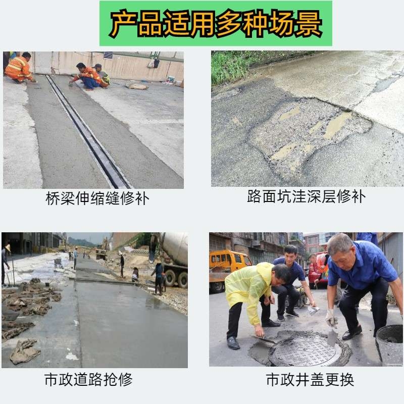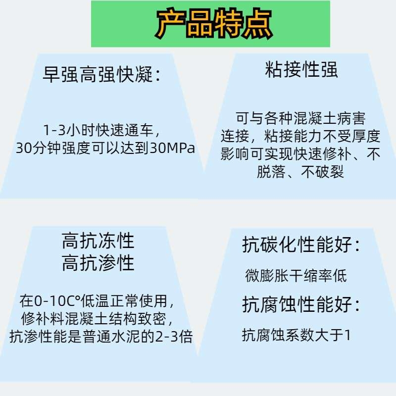 适用于水泥砼路面坑、槽、块的快速修补,也适于有快速通车要求的新混凝土路面摊铺。 与常规修补相比,每平方砼路面增加约10元材料费,但提前通车,减少了养护费用,保证了交通畅通,取得了好的社会效益和经济效益。 主要技术指标 (1)混凝土的和易性好,初凝时间正常,施工方便,对气候适应性强,可在5℃~35℃气温下施工。 (2)早期强度高,一天抗折强度可比基体砼抗折强度提高1倍多,达3.5~4.2MPa,满足水泥混凝土路面一天通车的要求;后期强度稳定发展,二十八天抗折强度可达6~7MPa。 (3)干缩率小,与老混凝土粘结性能好,最终干缩率为0.12‰ 。 |