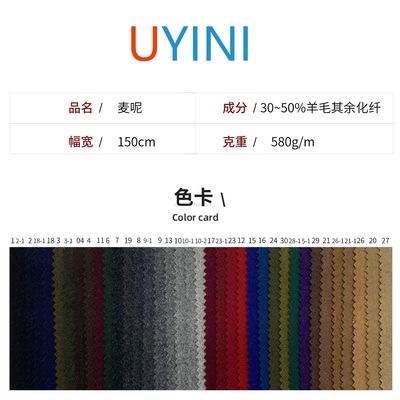 品质标准:中国纺织行业标准(FZ)|品种:麦尔登|成分及含量:30-50%羊毛|其它化纤|幅宽:150cm|克重:380(g/㎡)|纺织工艺:粗纺|花型:素色|具体用途:外套,西装,床上用品,箱包,窗帘,休闲服,工作服,时装,大衣,汽车内饰,装饰布,沙发,桌布、台布,地毯、毛毯|货号:UYINI 2020麦呢|别名:麦尔登|适用季节:秋冬|品牌:悠依尼|流行元素:欧美|颜色:1,2-1,2,18-1,18,3,3-1,04,4,11,6,7,19,8,9-1,9,13,10,10-1,10-2,17,23-1,23,12,15,16,24,30,28-1,5-1,29,21,26-1,21-1,26,20,27|是否跨境出口专供货源:否